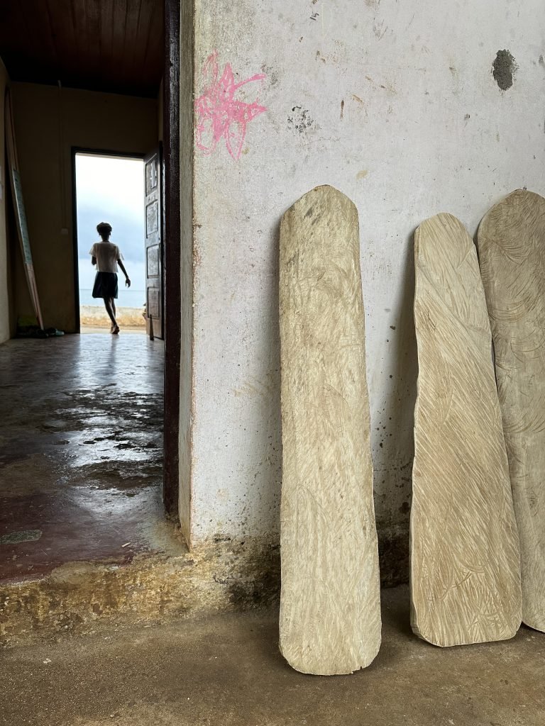 At the Biennale, a board made by the children was presented alongside my paintings. The board stood as a symbol of Santomean identity and a gesture of restoration, while the paintings imagine possible futures.